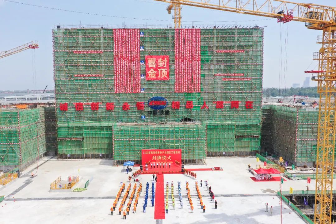 高高矗立,與藍(lán)天白云交相輝映,紅布金字的字樣顯得格外矚目。經(jīng)歷9個月的緊張高效施工,運(yùn)營中心主體結(jié)構(gòu)封頂,標(biāo)志著新園區(qū)基礎(chǔ)設(shè)施及廠房配套項(xiàng)目建設(shè)取得了重要的階段性勝利,為后續(xù)施工奠定了堅(jiān)實(shí)的基礎(chǔ)。