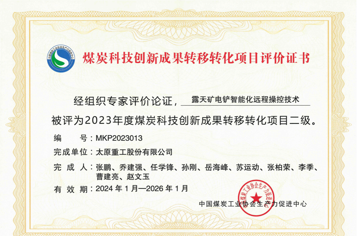 近日,公司“露天礦電鏟智能化遠(yuǎn)程操控技術(shù)”成果,在中國(guó)煤炭工業(yè)協(xié)會(huì)生產(chǎn)力促進(jìn)中心組織的2023年度煤炭科技創(chuàng)新成果轉(zhuǎn)移轉(zhuǎn)化項(xiàng)目評(píng)價(jià)中,被評(píng)為煤炭科技創(chuàng)新成果轉(zhuǎn)移轉(zhuǎn)化項(xiàng)目二級(jí)。