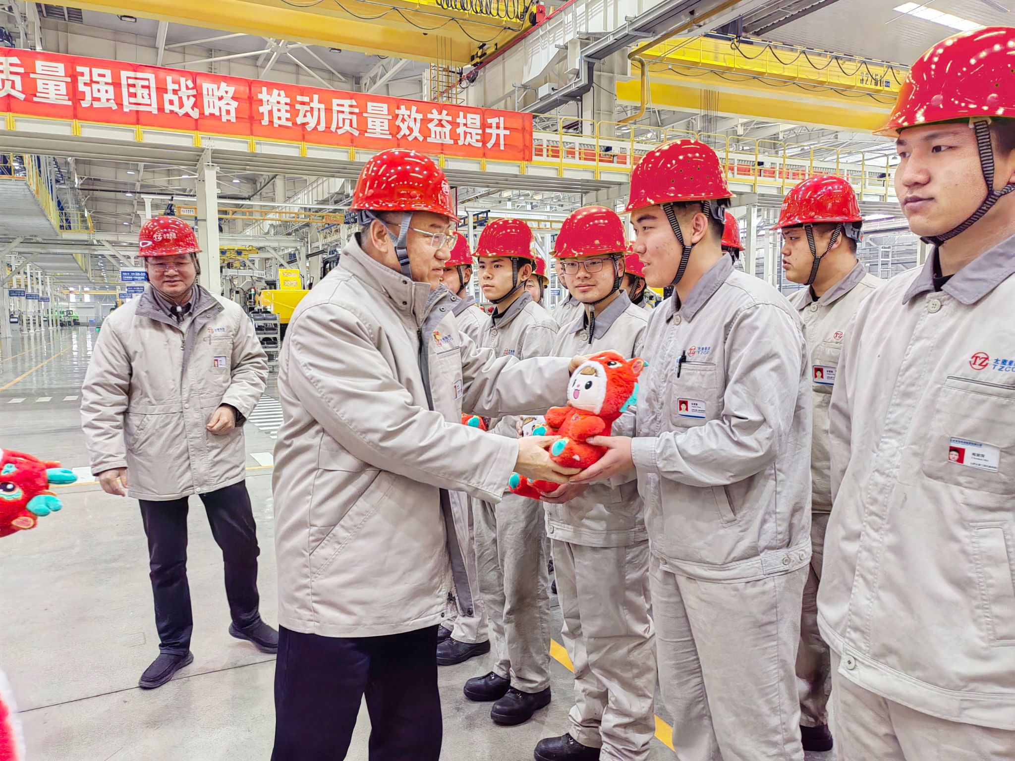 “新春快樂(lè)!祝太重蒸蒸日上!”中挖裝配生產(chǎn)現(xiàn)場(chǎng),職工們個(gè)個(gè)精神抖擻、意氣風(fēng)發(fā),齊聲喊出新春祝福。“給大家拜個(gè)早年,祝廣大干部職工及職工家屬新年快樂(lè)!龍年將至,祝大家龍馬精神、龍騰虎躍!”韓珍堂說(shuō),2023年,工程機(jī)械公司做了大量卓有成效的工作,對(duì)大家的辛勤付出表示感謝,并用“三個(gè)快”總結(jié)了一年來(lái)取得的成績(jī)。建設(shè)速度快——從2022年5月開(kāi)工奠基到2023年7月建成投產(chǎn),14個(gè)月時(shí)間建成了世界上單一工廠規(guī)模最大、工序最全的挖掘機(jī)智慧工廠,創(chuàng)造了同行業(yè)最好水平。新品開(kāi)發(fā)快——去年共設(shè)計(jì)完成45款挖機(jī)、8款旋挖鉆機(jī),實(shí)現(xiàn)0.8-150噸級(jí)全系列、多動(dòng)力覆蓋。融合發(fā)展快——大家因?yàn)楣餐氖聵I(yè),從五湖四海相聚到一起,專(zhuān)業(yè)人才相互碰撞融合,鑄就了強(qiáng)大的凝聚力、向心力,為公司高質(zhì)量高速度發(fā)展奠定了堅(jiān)實(shí)基礎(chǔ)。韓珍堂強(qiáng)調(diào),今年是公司轉(zhuǎn)型新生的攻堅(jiān)之年。集團(tuán)公司發(fā)展任務(wù)艱巨繁重,而最艱巨、最繁重的任務(wù)還在工程機(jī)械公司。只有以批量化作基礎(chǔ)、綠色裝備為底色,我們的工程機(jī)械才能更有市場(chǎng)、更有競(jìng)爭(zhēng)力!打造“規(guī)?;?、批量化、效益化”產(chǎn)品,工程機(jī)械要率先實(shí)現(xiàn);打造“綠色化、智能化、國(guó)產(chǎn)化”產(chǎn)品,工程機(jī)械也要率先實(shí)現(xiàn)!要開(kāi)疆拓土,打造國(guó)際化公司,讓太重產(chǎn)品、太重品牌揚(yáng)帆出海、遍布世界舞臺(tái)。要對(duì)標(biāo)學(xué)習(xí)、超越先進(jìn)、成為先進(jìn),打造引領(lǐng)機(jī)械行業(yè)最高水平的智慧工廠!這是對(duì)大家的期望,也是全體太重人要為之奮斗的目標(biāo)!字字懇切、句句提氣又溫情滿滿。隨后韓珍堂將新年吉祥物一一送至職工手中。現(xiàn)場(chǎng)的干部職工深受鼓舞、倍感振奮,在溫暖中收獲了奮進(jìn)的力量,更加堅(jiān)定了未來(lái)努力的方向。大家紛紛表示,將進(jìn)一步增強(qiáng)責(zé)任感、使命感,認(rèn)真履職盡責(zé)、主動(dòng)擔(dān)當(dāng)作為,爭(zhēng)做轉(zhuǎn)型發(fā)展的排頭兵,為實(shí)現(xiàn)振興崛起的“太重夢(mèng)”不懈奮斗!