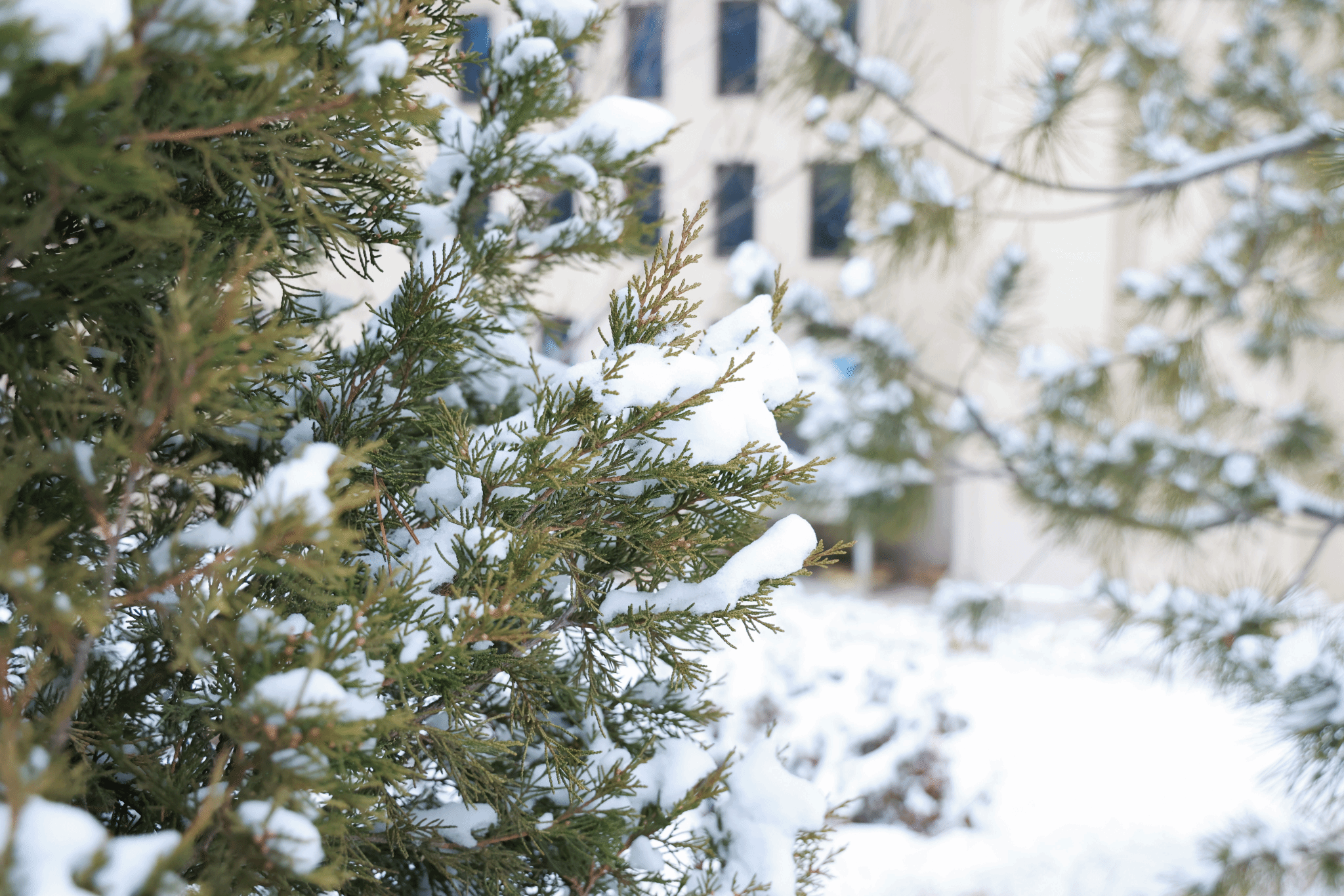 雪天的純白色調(diào)彷佛為公司“加了濾鏡”,更顯色彩對比之美。看青色,“歲暮滿山雪,松色郁青蒼”。