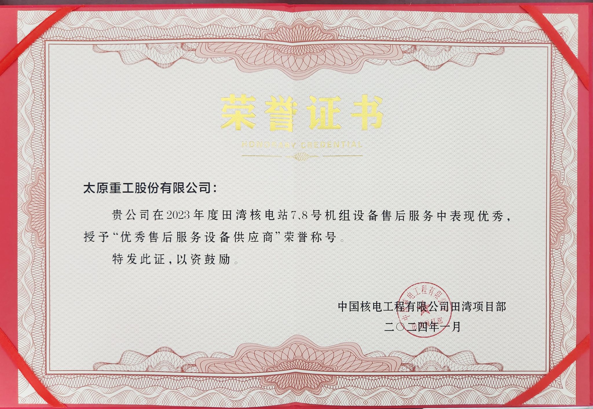 此次榮譽(yù)的獲得,既是雙方友好合作的見(jiàn)證,也是對(duì)未來(lái)加強(qiáng)合作的期待,是用戶(hù)對(duì)太重創(chuàng)新能力、產(chǎn)品質(zhì)量、現(xiàn)場(chǎng)服務(wù)及企業(yè)文化等多方面的肯定。新的一年,公司將繼續(xù)深入踐行“三精三致三效”理念,不斷提升產(chǎn)品性能、優(yōu)化服務(wù)質(zhì)量,提升公司在核電領(lǐng)域的影響力和美譽(yù)度,堅(jiān)決扛牢實(shí)現(xiàn)新型工業(yè)化這個(gè)關(guān)鍵任務(wù),為扎實(shí)推進(jìn)核工業(yè)高質(zhì)量發(fā)展貢獻(xiàn)太重力量!