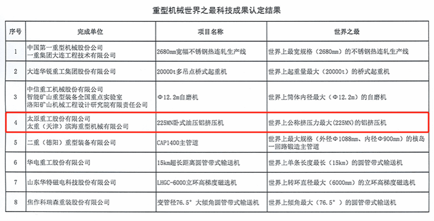 近日,中國(guó)重型機(jī)械工業(yè)協(xié)會(huì)組織認(rèn)定的“重型機(jī)械世界之最科技成果”名單出爐,由太重自主設(shè)計(jì)研發(fā)的“225MN臥式鋁擠壓機(jī)”成功入選,再次展現(xiàn)了太重在鍛壓設(shè)備領(lǐng)域無可爭(zhēng)議的領(lǐng)先地位。
