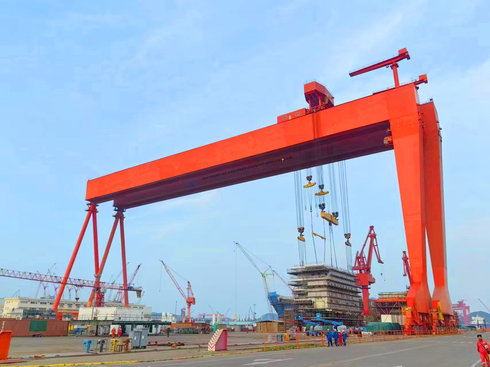 造船門式起重機(jī)作為太重的拳頭產(chǎn)品,是橋式起重機(jī)的一種變形型式,不僅繼承了橋式起重機(jī)的固有優(yōu)勢,還具有場地利用率高、作業(yè)范圍大、適應(yīng)面廣、通用性強(qiáng)等特點(diǎn)。投入運(yùn)行后,能夠?yàn)闃I(yè)主船塢內(nèi)在建項(xiàng)目提供更大的起吊能力,在項(xiàng)目建造、碼頭船舶的裝卸作業(yè)中擔(dān)大任、挑大梁。此次簽單的兩臺設(shè)備中,其中一臺的起重量高達(dá)1200噸,起升高度不低于76米,跨距162米,作業(yè)區(qū)域可以覆蓋用戶整個總裝場地,綜合性能達(dá)到國際先進(jìn)水平,設(shè)備投用后,能大幅度提高用戶總裝分段工作效率,提升用戶市場競爭力。另一臺則用于千噸級模塊的總裝、搭載及其大型設(shè)備的吊裝作業(yè)。