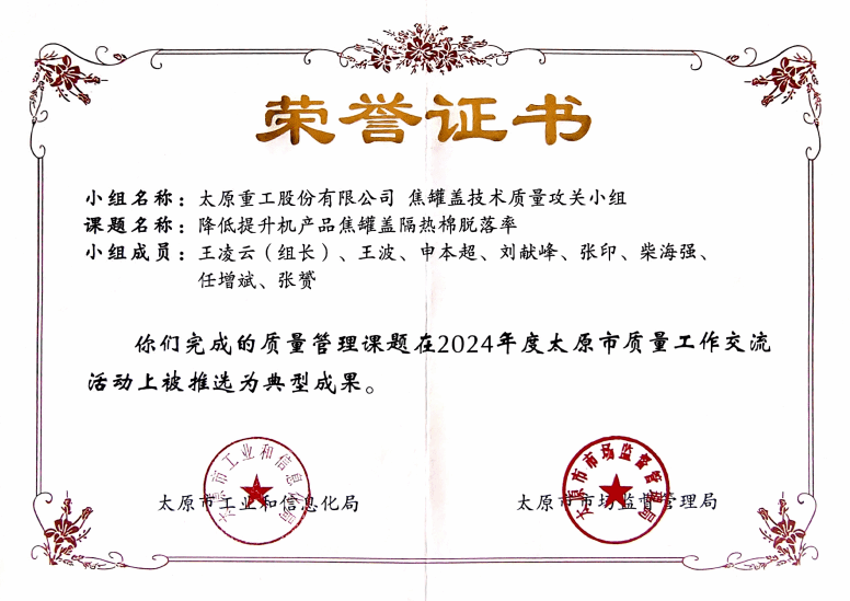 近日,2024年度太原市質(zhì)量工作交流活動順利舉行,太重冶金分公司售后服務(wù)工部獲評“質(zhì)量信得過班組”,5個QC小組項目均被推選為典型成果。其中“提升板材矯直機現(xiàn)場安裝交檢一次性合格率”“降低提升機產(chǎn)品焦罐蓋隔熱棉脫落率”課題還被推薦參加山西省質(zhì)量交流活動成果發(fā)布。