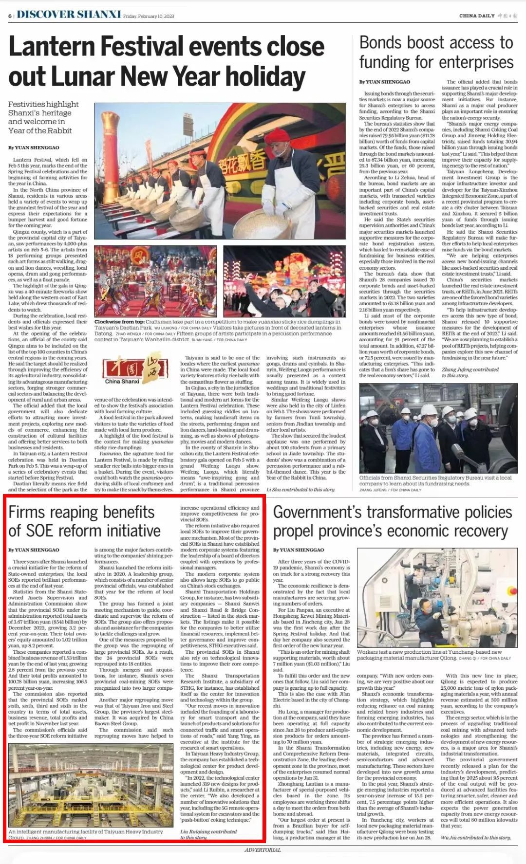 2月10日,中國日報(bào)全英文刊發(fā)《Firms reaping benefits of SOE reform initiative》文章,報(bào)道太重扎實(shí)推進(jìn)國企改革三年行動,探索科技創(chuàng)新體系和高端裝備制造產(chǎn)業(yè)深度融合的發(fā)展新路,營造了良好的創(chuàng)新生態(tài),夯實(shí)了公司轉(zhuǎn)型發(fā)展的堅(jiān)實(shí)根基。
