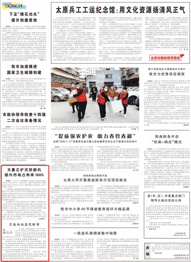 近期,太原日報(bào)以《太重正鏟式挖掘機(jī)國內(nèi)市場占有率100%》為題對太重集團(tuán)礦用挖掘機(jī)勇登行業(yè)“塔尖”進(jìn)行報(bào)道。太重集團(tuán)大力實(shí)施科技創(chuàng)新和人才強(qiáng)企戰(zhàn)略,堅(jiān)持把創(chuàng)新擺在公司轉(zhuǎn)型發(fā)展全局的核心位置,為太重在全省轉(zhuǎn)型發(fā)展中發(fā)揮龍頭帶動作用聚力賦能。