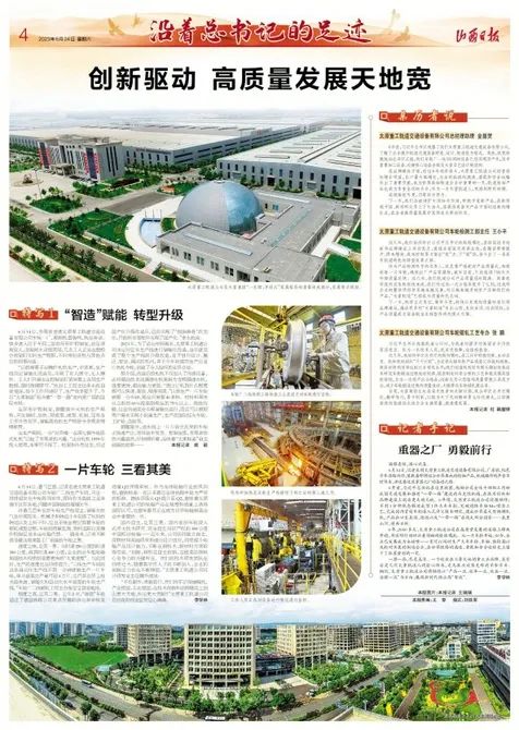 6月24日,山西日報頭版及四版整版多篇報道紛紛聚焦太重集團,深入報道了在習近平總書記考察調研太重六年間的巨大變化。太重集團在高質量發(fā)展的道路上蹄疾步穩(wěn),用實際行動回應著領袖的殷殷囑托。作為省內唯一“雙鏈主”企業(yè),太重不斷加大科研投入力度,在突破關鍵核心技術、促進產業(yè)轉型升級的最前沿業(yè)績突出,蔚然形成千帆奮競、全面創(chuàng)新的生動局面,受到了主流媒體的關注。